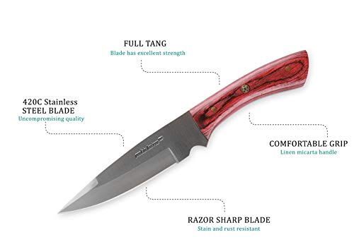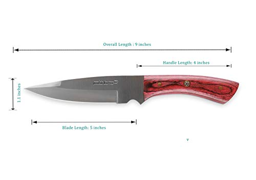 22.86 cm Couteau de chasse fixe Longueur de la lame: 12,70cm, matériau de la lame: acier inoxydable 420 Matériau du manche: manche en micarta Dureté: 50-52 Il est livré avec une gaine en cuir