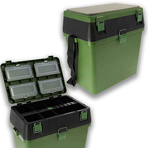 Riverside Boîte de siège robuste – Cette fantastique boîte de siège de qualité est idéale pour la pêche en mer, la pêche à la mouche, la traque ou n’importe où en déplacement. Caractéristiques du siège : construction ABS de haute qualité, 4 boîtes de rangement dans la section supérieure, séparateurs amovibles dans la section centrale, section principale de 18 litres, section centrale de 3 litres, sangle rembourrée et coussin de siège inclus, peut supporter jusqu’à 20 kg, dimensions de la boîte de siège : environ 38 cm x 23 cm x 37 cm